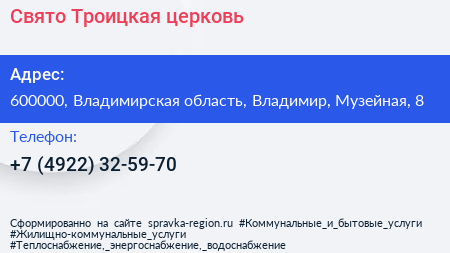 Свято Троицкая церковь по адресу 600000, Владимирская область, Владимир, Музейная, 8 в дальнейшем Организация, размещена в следующих категориях: