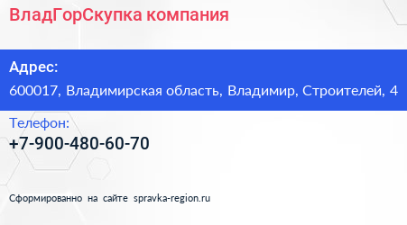 ВладГорСкупка, компания по адресу 600017, Владимирская область, Владимир, Строителей, 4 в дальнейшем Организация, размещена в следующих категориях: