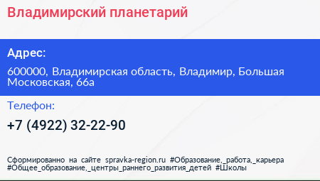 Владимирский планетарий по адресу 600000, Владимирская область, Владимир, Большая Московская, 66а в дальнейшем Организация, размещена в следующих категориях: