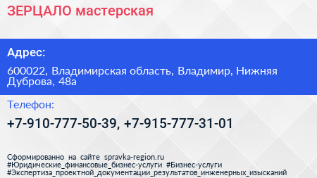 ЗЕРЦАЛО, мастерская по адресу 600022, Владимирская область, Владимир, Нижняя Дуброва, 48а в дальнейшем Организация, размещена в следующих категориях:
