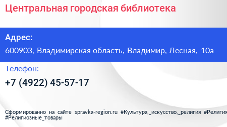 Центральная городская библиотека по адресу 600903, Владимирская область, Владимир, Лесная, 10а в дальнейшем Организация, размещена в следующих категориях: