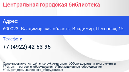 Центральная городская библиотека по адресу 600023, Владимирская область, Владимир, Песочная, 15 в дальнейшем Организация, размещена в следующих категориях: