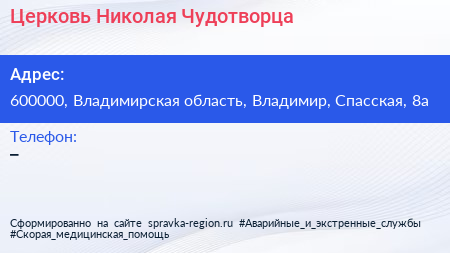 Церковь Николая Чудотворца по адресу 600000, Владимирская область, Владимир, Спасская, 8а в дальнейшем Организация, размещена в следующих категориях: