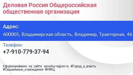 Деловая Россия, Общероссийская общественная организация по адресу 600005, Владимирская область, Владимир, Тракторная, 46 в дальнейшем Организация, размещена в следующих категориях: