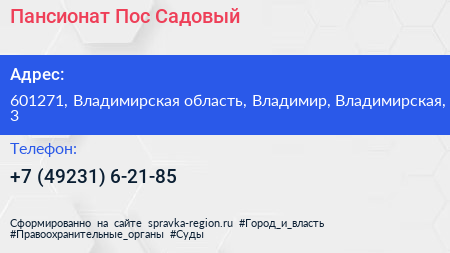 Пансионат Пос.Садовый по адресу 601271, Владимирская область, Владимир, Владимирская, 3 в дальнейшем Организация, размещена в следующих категориях: