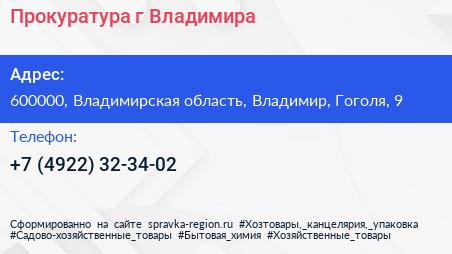Прокуратура г. Владимира по адресу 600000, Владимирская область, Владимир, Гоголя, 9 в дальнейшем Организация, размещена в следующих категориях: