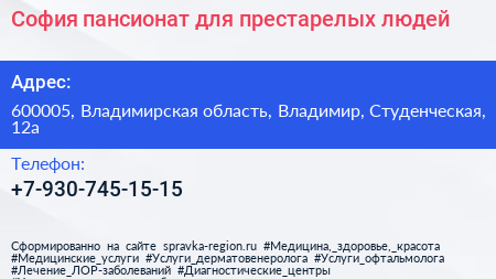 София, пансионат для престарелых людей по адресу 600005, Владимирская область, Владимир, Студенческая, 12а в дальнейшем Организация, размещена в следующих категориях:
