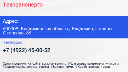 Техкранэнерго по адресу 600009, Владимирская область, Владимир, Полины Осипенко, 66 в дальнейшем Организация, размещена в следующих категориях: