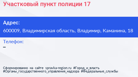 Участковый пункт полиции №17 по адресу 600009, Владимирская область, Владимир, Каманина, 18 в дальнейшем Организация, размещена в следующих категориях: