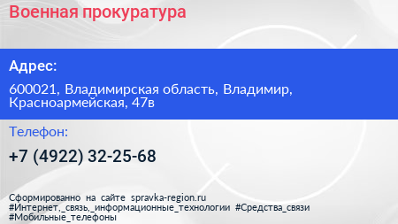 Военная прокуратура по адресу 600021, Владимирская область, Владимир, Красноармейская, 47в в дальнейшем Организация, размещена в следующих категориях: