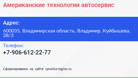 Американские технологии, автосервис по адресу 600035, Владимирская область, Владимир, Куйбышева, 28/3 в дальнейшем Организация, размещена в следующих категориях: