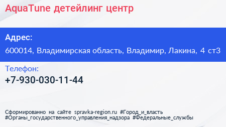 AquaTune, детейлинг-центр по адресу 600014, Владимирская область, Владимир, Лакина, 4 ст3 в дальнейшем Организация, размещена в следующих категориях: