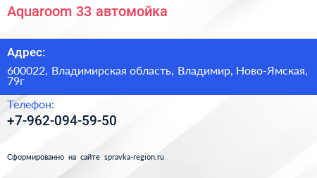 Aquaroom 33, автомойка по адресу 600022, Владимирская область, Владимир, Ново-Ямская, 79г в дальнейшем Организация, размещена в следующих категориях: