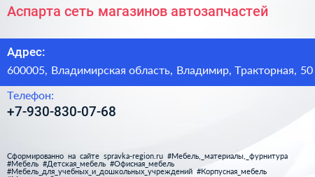 Аспарта, сеть магазинов автозапчастей по адресу 600005, Владимирская область, Владимир, Тракторная, 50 в дальнейшем Организация, размещена в следующих категориях: