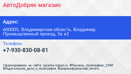 АвтоДобряк, магазин по адресу 600005, Владимирская область, Владимир, Промышленный проезд, 5в к1 в дальнейшем Организация, размещена в следующих категориях: