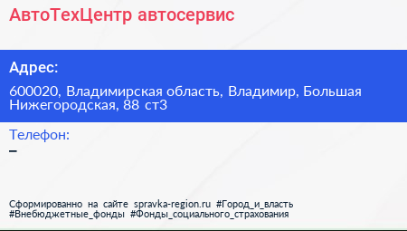АвтоТехЦентр, автосервис по адресу 600020, Владимирская область, Владимир, Большая Нижегородская, 88 ст3 в дальнейшем Организация, размещена в следующих категориях: