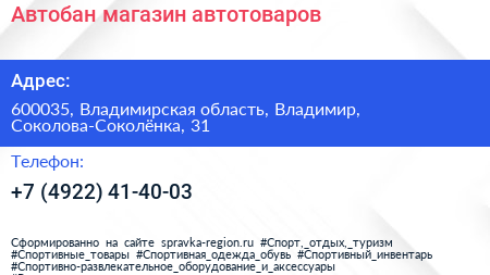 Автобан, магазин автотоваров по адресу 600035, Владимирская область, Владимир, Соколова-Соколёнка, 31 в дальнейшем Организация, размещена в следующих категориях: