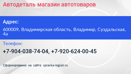Автодеталь, магазин автотоваров по адресу 600009, Владимирская область, Владимир, Суздальская, 4а в дальнейшем Организация, размещена в следующих категориях: