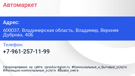 Автомаркет по адресу 600037, Владимирская область, Владимир, Верхняя Дуброва, 40Б в дальнейшем Организация, размещена в следующих категориях: