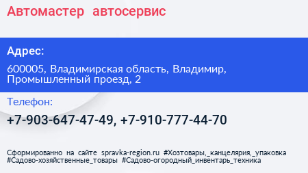 Автомастер+, автосервис по адресу 600005, Владимирская область, Владимир, Промышленный проезд, 2 в дальнейшем Организация, размещена в следующих категориях: