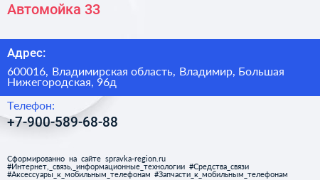 Автомойка 33 по адресу 600016, Владимирская область, Владимир, Большая Нижегородская, 96д в дальнейшем Организация, размещена в следующих категориях: