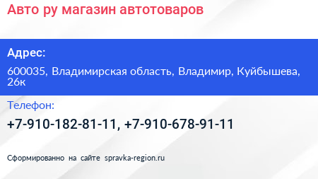 Авто.ру, магазин автотоваров по адресу 600035, Владимирская область, Владимир, Куйбышева, 26к в дальнейшем Организация, размещена в следующих категориях: