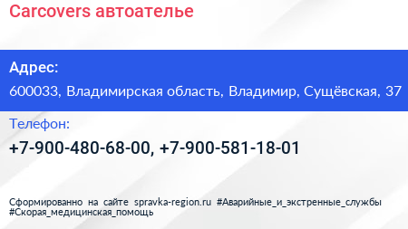 Carcovers, автоателье по адресу 600033, Владимирская область, Владимир, Сущёвская, 37 в дальнейшем Организация, размещена в следующих категориях: