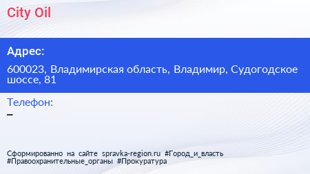 City Oil по адресу 600023, Владимирская область, Владимир, Судогодское шоссе, 81 в дальнейшем Организация, размещена в следующих категориях: