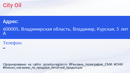 City Oil по адресу 600005, Владимирская область, Владимир, Курская, 5 лит А в дальнейшем Организация, размещена в следующих категориях: