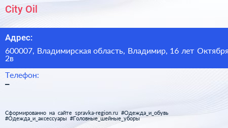City Oil по адресу 600007, Владимирская область, Владимир, 16 лет Октября, 2в в дальнейшем Организация, размещена в следующих категориях: