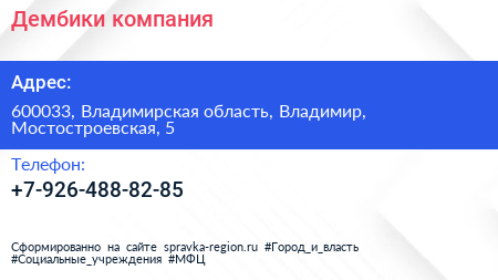 Дембики, компания по адресу 600033, Владимирская область, Владимир, Мостостроевская, 5 в дальнейшем Организация, размещена в следующих категориях: