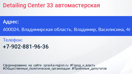 Detailing Center 33, автомастерская по адресу 600024, Владимирская область, Владимир, Василисина, 4г в дальнейшем Организация, размещена в следующих категориях: