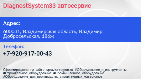 DiagnostSystem33, автосервис по адресу 600031, Владимирская область, Владимир, Добросельская, 186ж в дальнейшем Организация, размещена в следующих категориях: