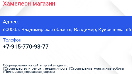 Хамелеон, магазин по адресу 600035, Владимирская область, Владимир, Куйбышева, 66 в дальнейшем Организация, размещена в следующих категориях: