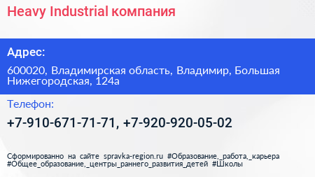 Heavy Industrial, компания по адресу 600020, Владимирская область, Владимир, Большая Нижегородская, 124а в дальнейшем Организация, размещена в следующих категориях: