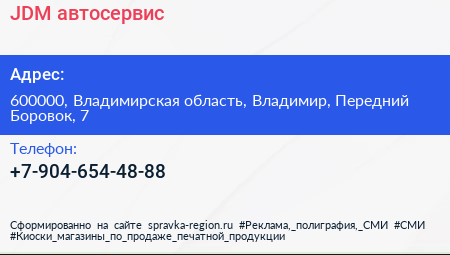 JDM, автосервис по адресу 600000, Владимирская область, Владимир, Передний Боровок, 7 в дальнейшем Организация, размещена в следующих категориях: