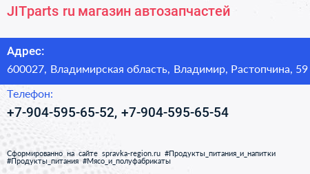 JITparts.ru, магазин автозапчастей по адресу 600027, Владимирская область, Владимир, Растопчина, 59 в дальнейшем Организация, размещена в следующих категориях: