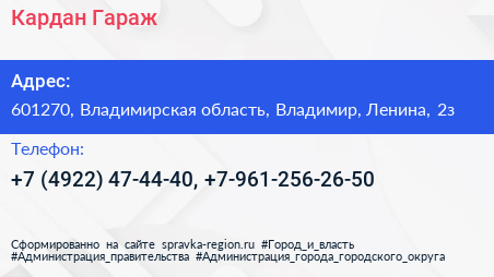 Кардан Гараж по адресу 601270, Владимирская область, Владимир, Ленина, 2з в дальнейшем Организация, размещена в следующих категориях:
