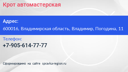 Крот, автомастерская по адресу 600016, Владимирская область, Владимир, Погодина, 11 в дальнейшем Организация, размещена в следующих категориях: