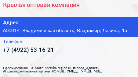 Крылья, оптовая компания по адресу 600014, Владимирская область, Владимир, Лакина, 1а в дальнейшем Организация, размещена в следующих категориях: