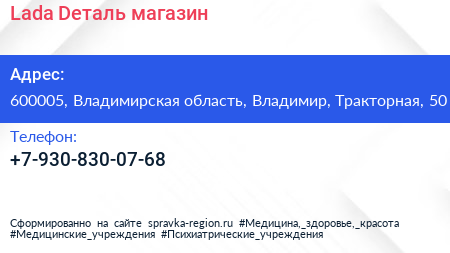 Lada Dеталь, магазин по адресу 600005, Владимирская область, Владимир, Тракторная, 50 в дальнейшем Организация, размещена в следующих категориях: