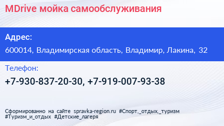 MDrive, мойка самообслуживания по адресу 600014, Владимирская область, Владимир, Лакина, 32 в дальнейшем Организация, размещена в следующих категориях: