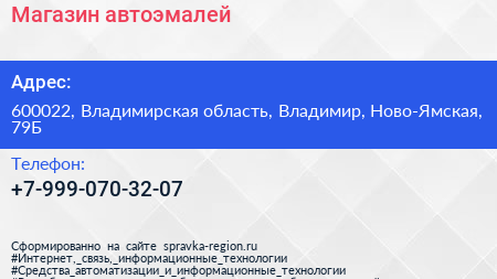 Магазин автоэмалей по адресу 600022, Владимирская область, Владимир, Ново-Ямская, 79Б в дальнейшем Организация, размещена в следующих категориях: