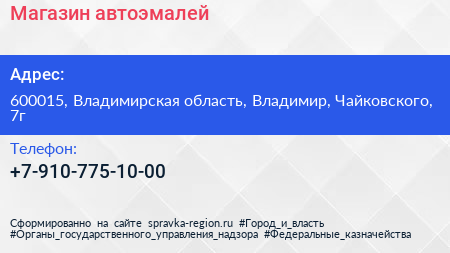 Магазин автоэмалей по адресу 600015, Владимирская область, Владимир, Чайковского, 7г в дальнейшем Организация, размещена в следующих категориях:
