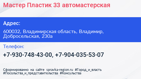 Мастер-Пластик 33, автомастерская по адресу 600032, Владимирская область, Владимир, Добросельская, 230а в дальнейшем Организация, размещена в следующих категориях: