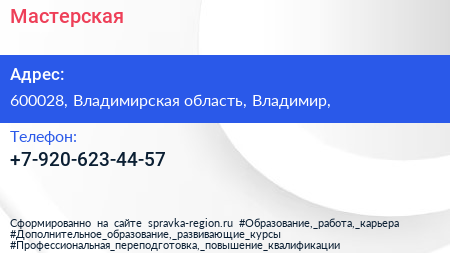 Мастерская по адресу 600028, Владимирская область, Владимир, в дальнейшем Организация, размещена в следующих категориях: