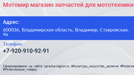 Мотомир, магазин запчастей для мототехники по адресу 600036, Владимирская область, Владимир, Ставровская, 4а в дальнейшем Организация, размещена в следующих категориях: