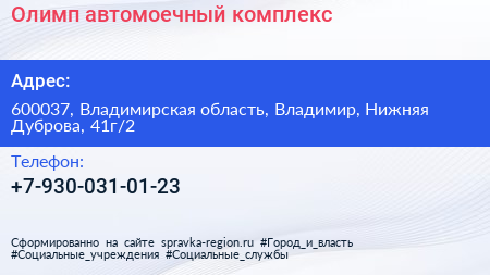 Олимп, автомоечный комплекс по адресу 600037, Владимирская область, Владимир, Нижняя Дуброва, 41г/2 в дальнейшем Организация, размещена в следующих категориях: