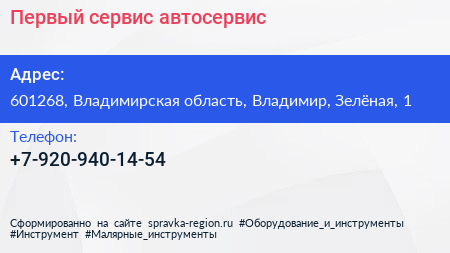 Первый сервис, автосервис по адресу 601268, Владимирская область, Владимир, Зелёная, 1 в дальнейшем Организация, размещена в следующих категориях: