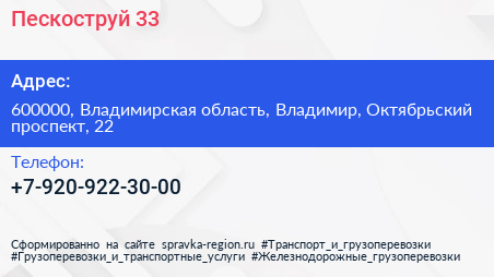 Пескоструй 33 по адресу 600000, Владимирская область, Владимир, Октябрьский проспект, 22 в дальнейшем Организация, размещена в следующих категориях: